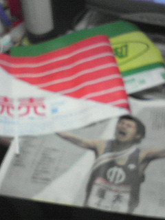 画像は沿道で振られているお馴染みの旗と84回大会PR新聞(上)と10区の大東大4年水越大輔選手(下)です。